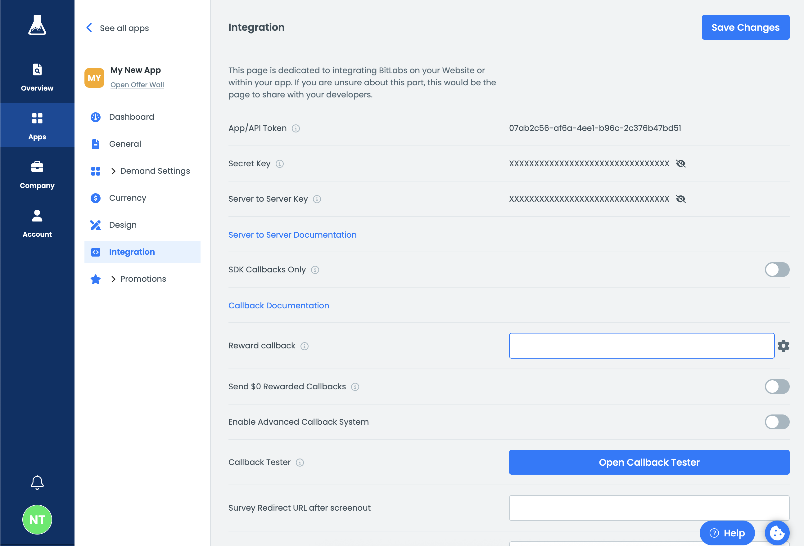 To set up the general reward callback, visit the Publisher Dashboard -> Apps -> Your App -> Integration -> Reward Callback: